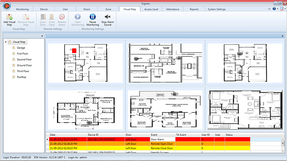 There is an option for Ingress Software to add in floor plan/map into the UI. Security officers can drag and drop the doors icons on UI, to have a better view to monitor. In a standard control room, there are multiple screens/LCDs, which publish individual floor plan/map so security officers never miss any of them. Security officer can view by individual floors: